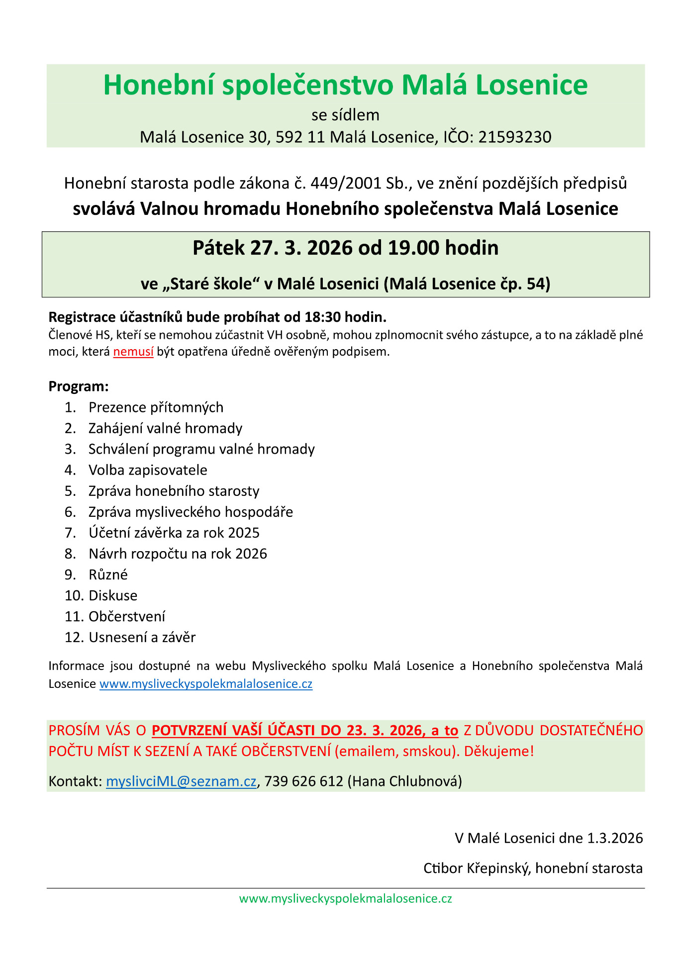 - POZVÁNKA NA VALNOU HROMADU HONEBNÍHO SPOLEČENSTVA MALÁ LOSENICE
